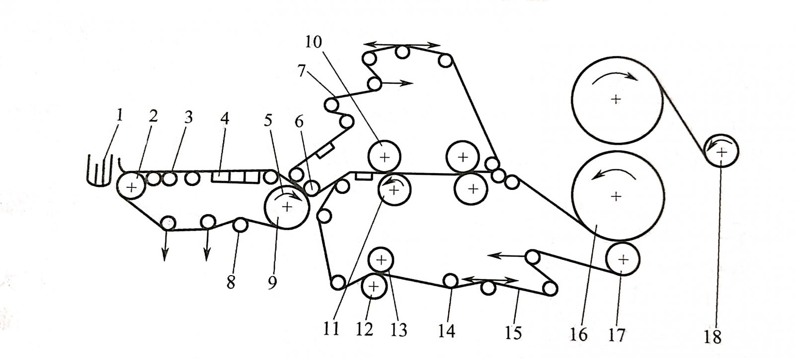 1-流浆箱;2-胸辊;3-案辊;4-吸水箱;5-下伏辊;6-上伏辊;7-上毯;8-导网辊;9-铜网;10-上压榨辊;11-下压榨辊;12-下挤水辊;13-上挤水辊;14-毛毯导辊;15-下毛毯;16-烘缸;17-烘缸托辊;18-卷纸辊